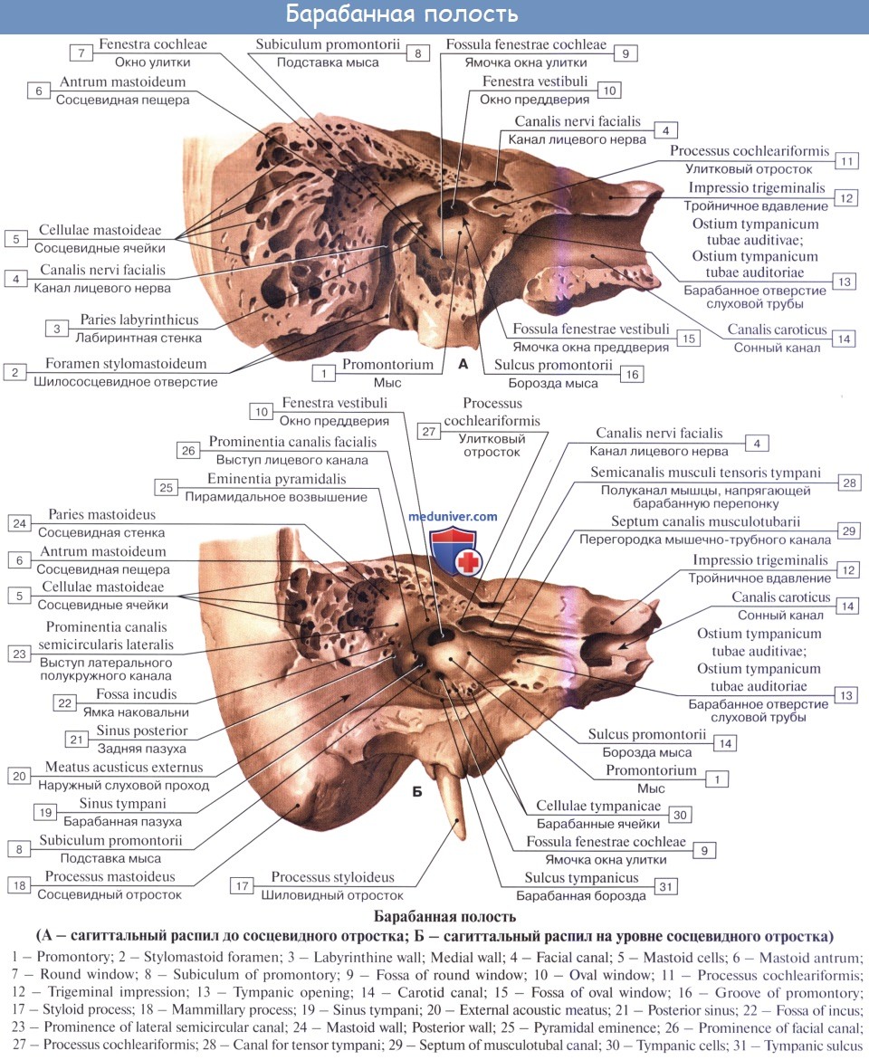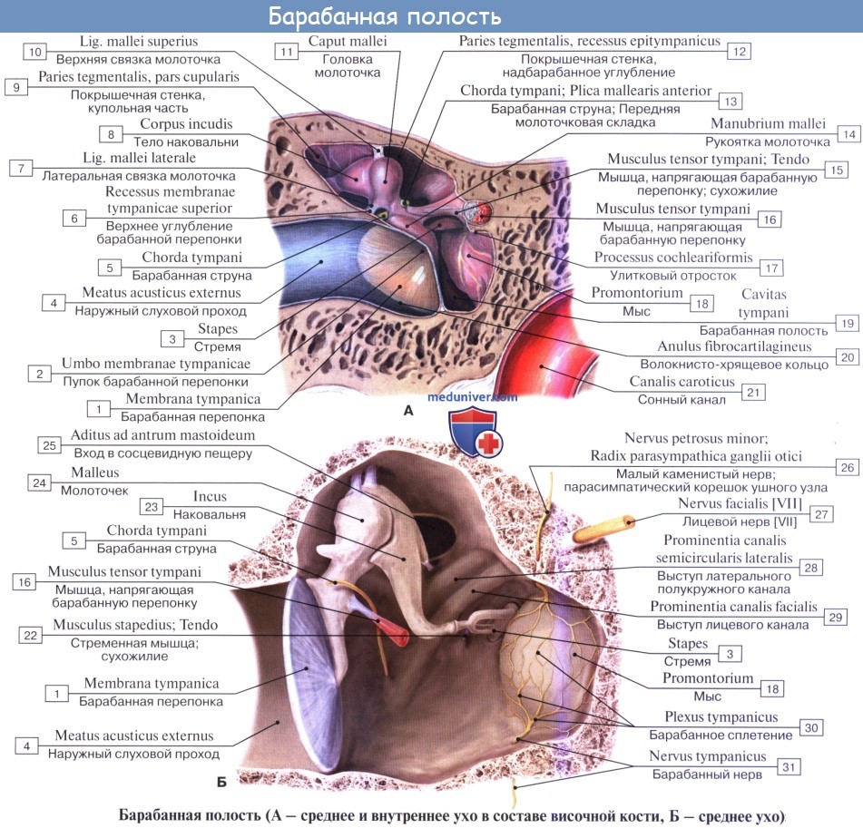 Барабанная полость имеет очень небольшую величину (объем около 1 см3) и напоминает поставленный на ребро бубен, сильно наклоненный в сторону наружного слухового прохода. В барабанной полости различают шесть стенок: