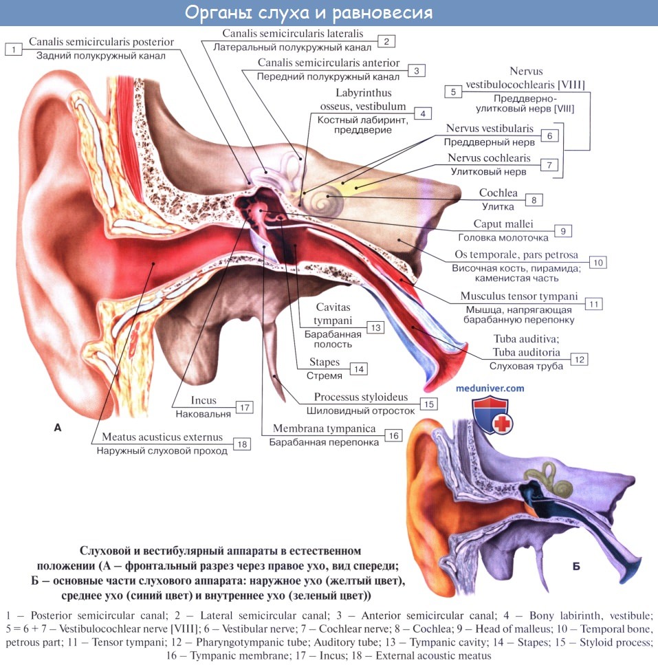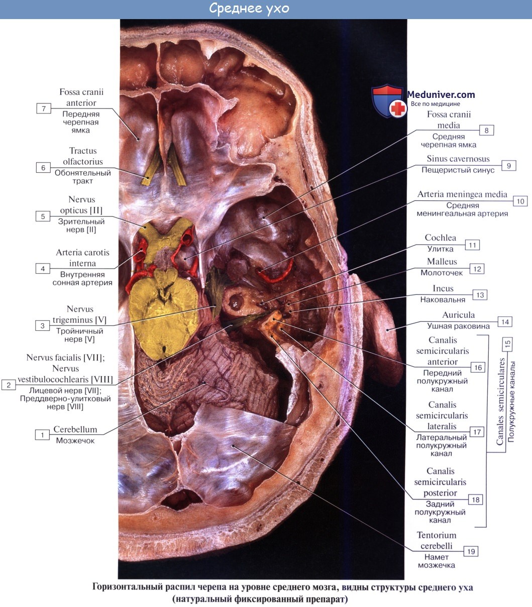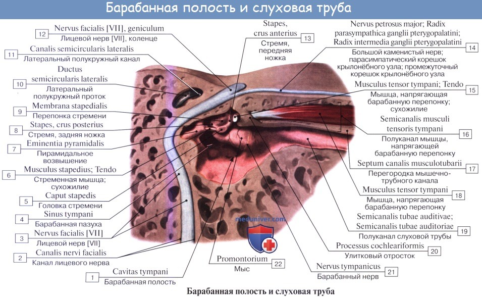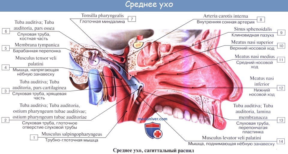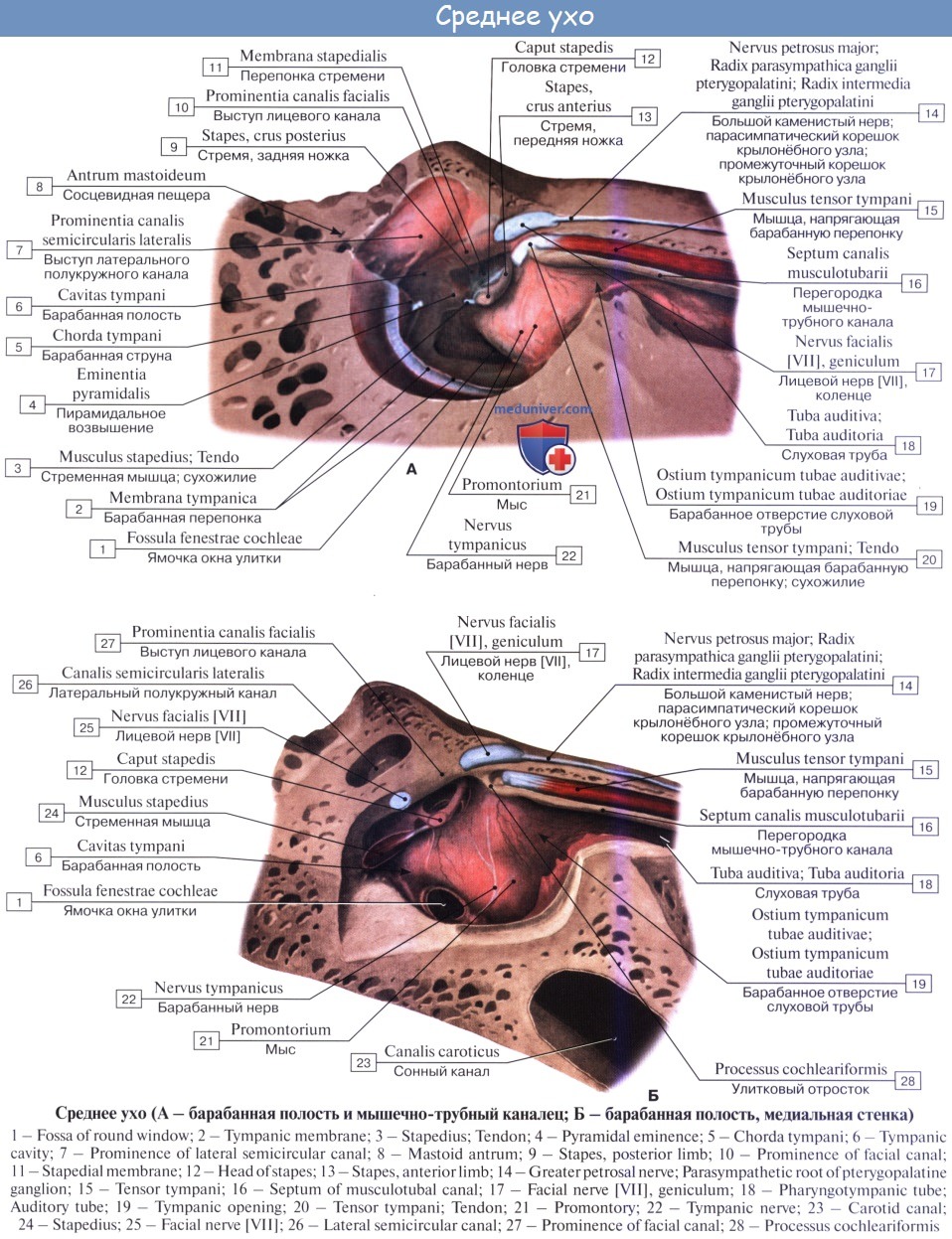 Среднее ухо, auris media, состоит из барабанной полости и слуховой трубы, сообщающей барабанную полость с носоглоткой.