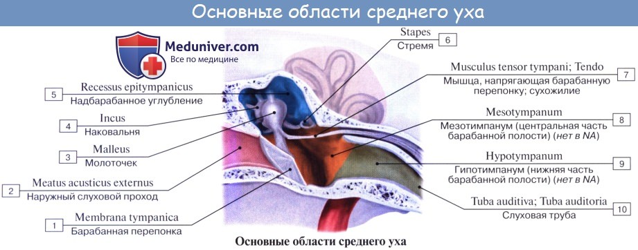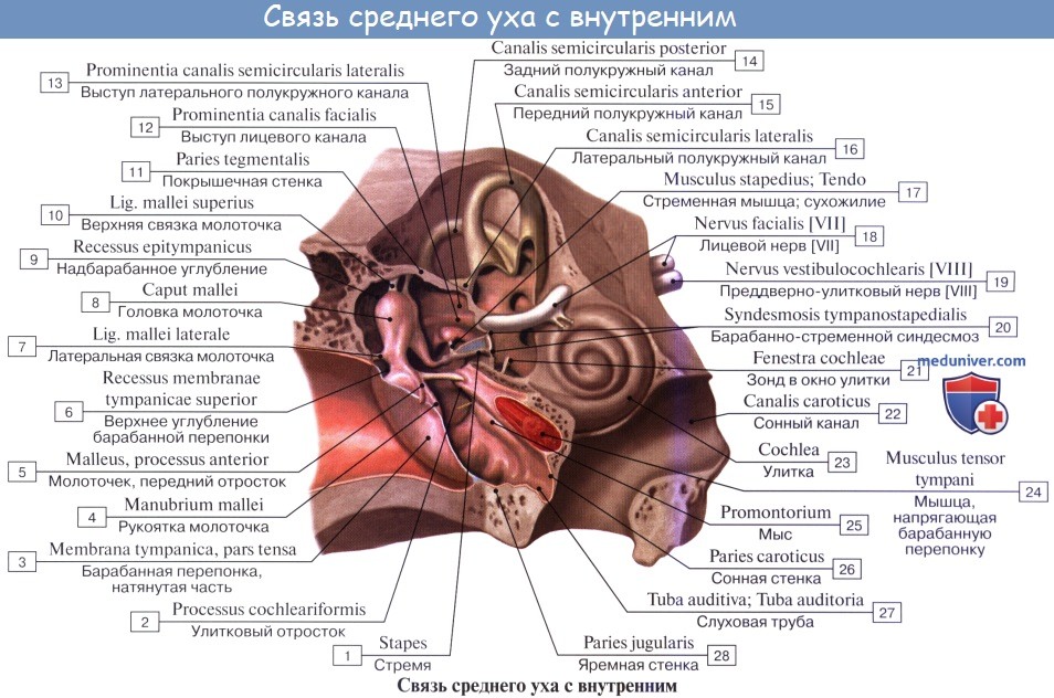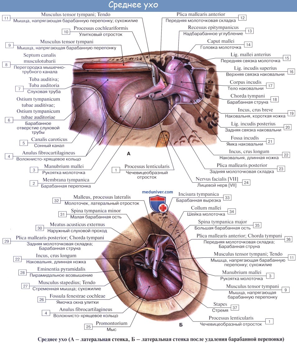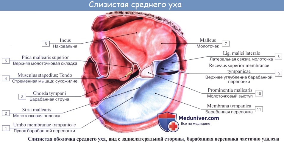 1. Латеральная стенка барабанной полости, paries membranaceus, образована барабанной перепонкой и костной пластинкой наружного слухового прохода. Верхняя куполообразно расширенная часть барабанной полости, recessus membranae tympani superior, содержит две слуховые косточки; головку молоточка и наковальню. При заболевании патологические изменения среднего уха наиболее выражены в этом recessus.