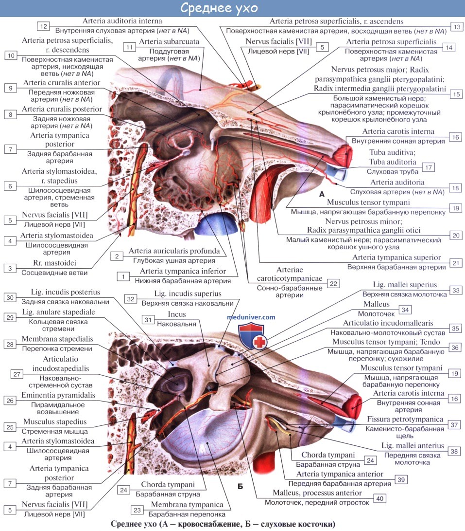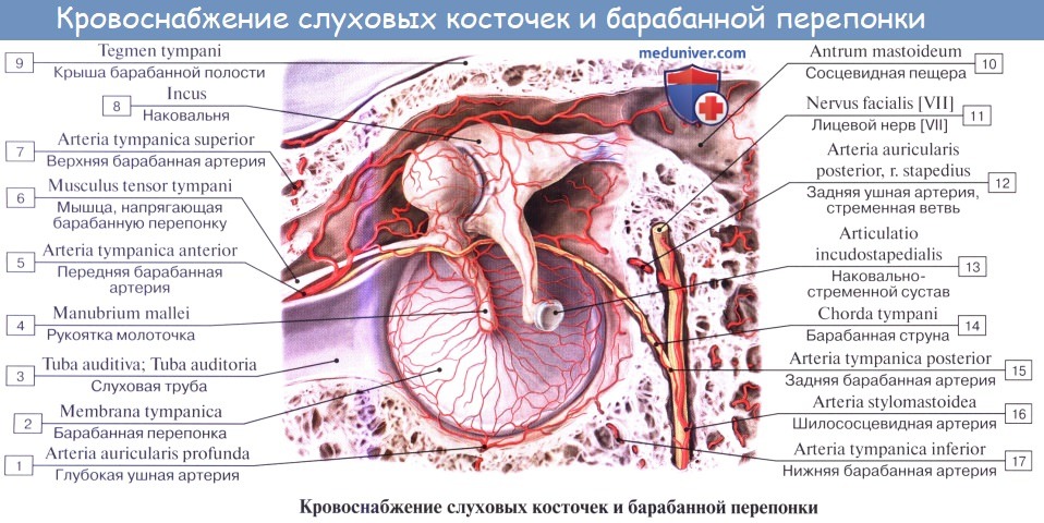 Сосуды и нервы среднего уха. Артерии происходят главным образом от a. carotis externa. Многочисленные сосуды проникают в барабанную полость от ее ветвей: от a. auricularis posterior, a. maxillaris, a pharyngea ascendens, а также от ствола a. carotis interna при прохождении ее через свой канал. Вены сопровождают артерии и впадают в plexus pharyngeus, vv. meningeae mediae и v. auricularis profunda.