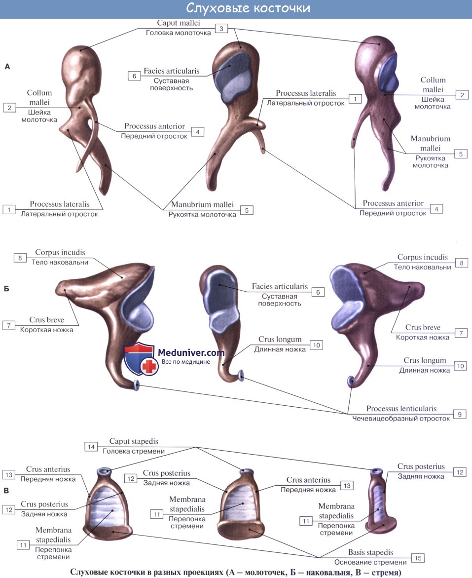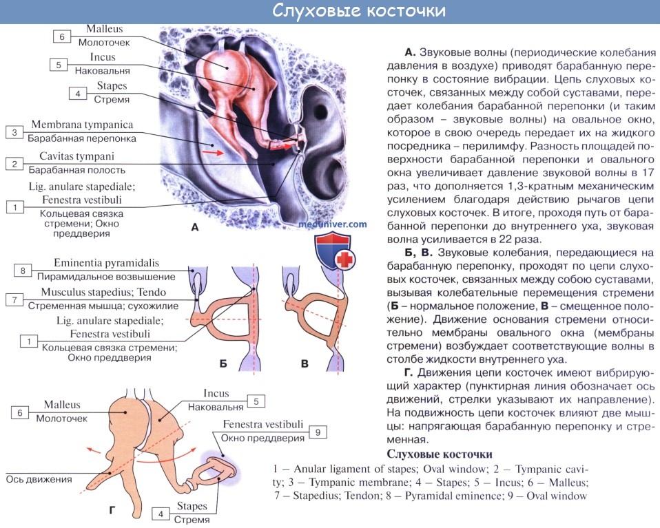 Находящиеся в барабанной полости три маленькие слуховые косточки носят по своему виду названия молоточка, наковальни и стремени.