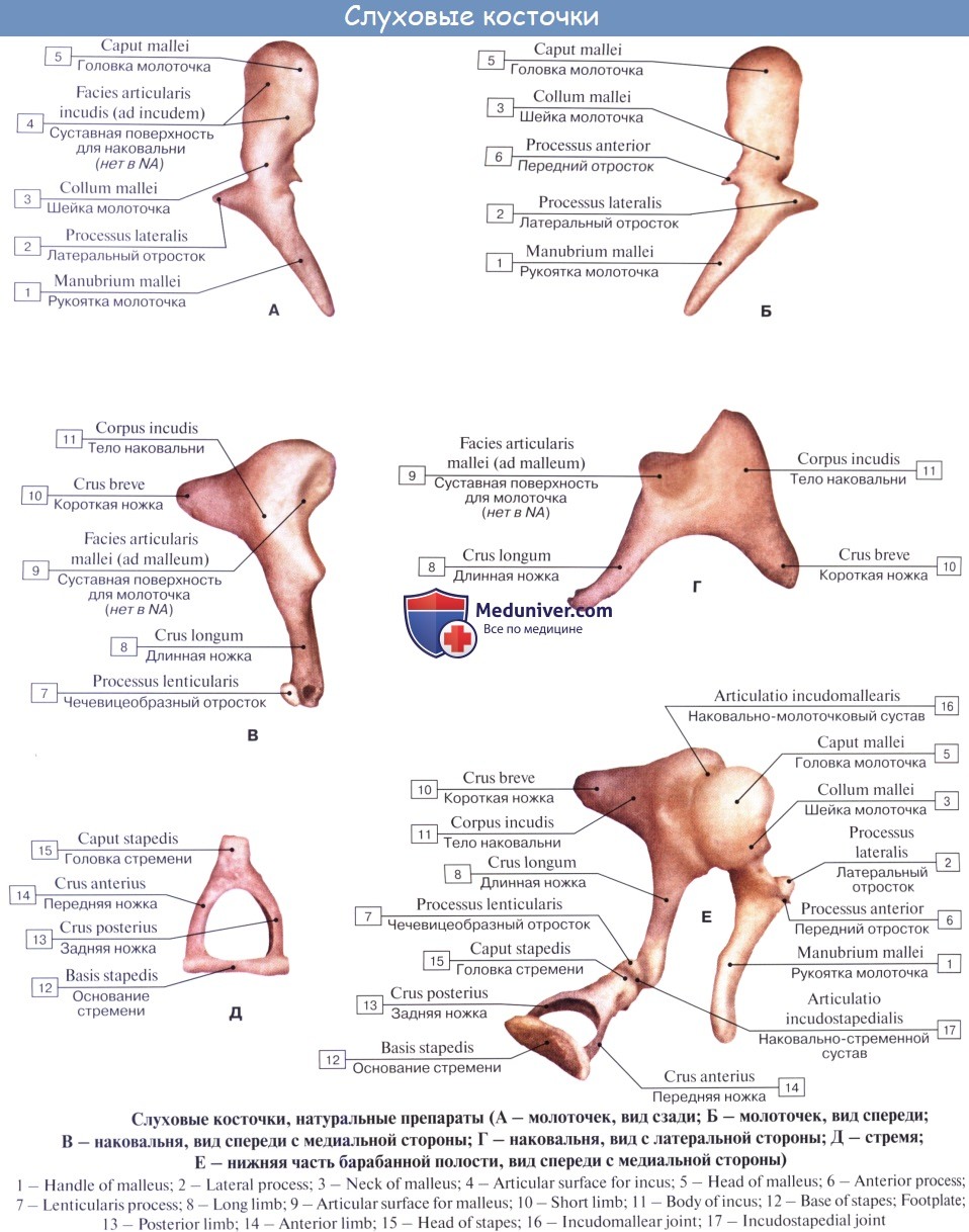 1. Молоточек, malleus, снабжен округлой головкой, caput mallei, которая при посредстве шейки, collum mallei, соединяется с рукояткой, manubrium mallei.