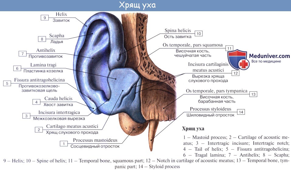 Ушная раковина, auricula, называемая обычно просто ухом, образована эластическим хрящом, покрытым кожей. Этот хрящ определяет внешнюю форму ушной раковины и ее выступы: свободный загнутый край — завиток, helix, и параллельно ему — противозавиток, anthelix, а также передний выступ — козелок, tragus, и лежащий сзади него противокозелок, antitragus.