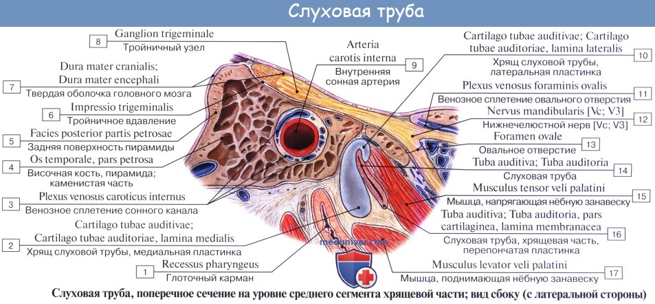 Слуховая, или евстахиева, труба, tuba auditiva (Eustachii; отсюда название воспаления трубы — евстахиит), служит для доступа воздуха из глотки в барабанную полость, чем поддерживается равновесие между давлением в этой полости и внешним атмосферным давлением, что необходимо для правильного проведения к лабиринту колебаний барабанной перепонки. Слуховая труба состоит из костной и хрящевой частей, которые соединяются между собой. На месте их соединения (isthmus tubae) канал трубы наиболее узок.