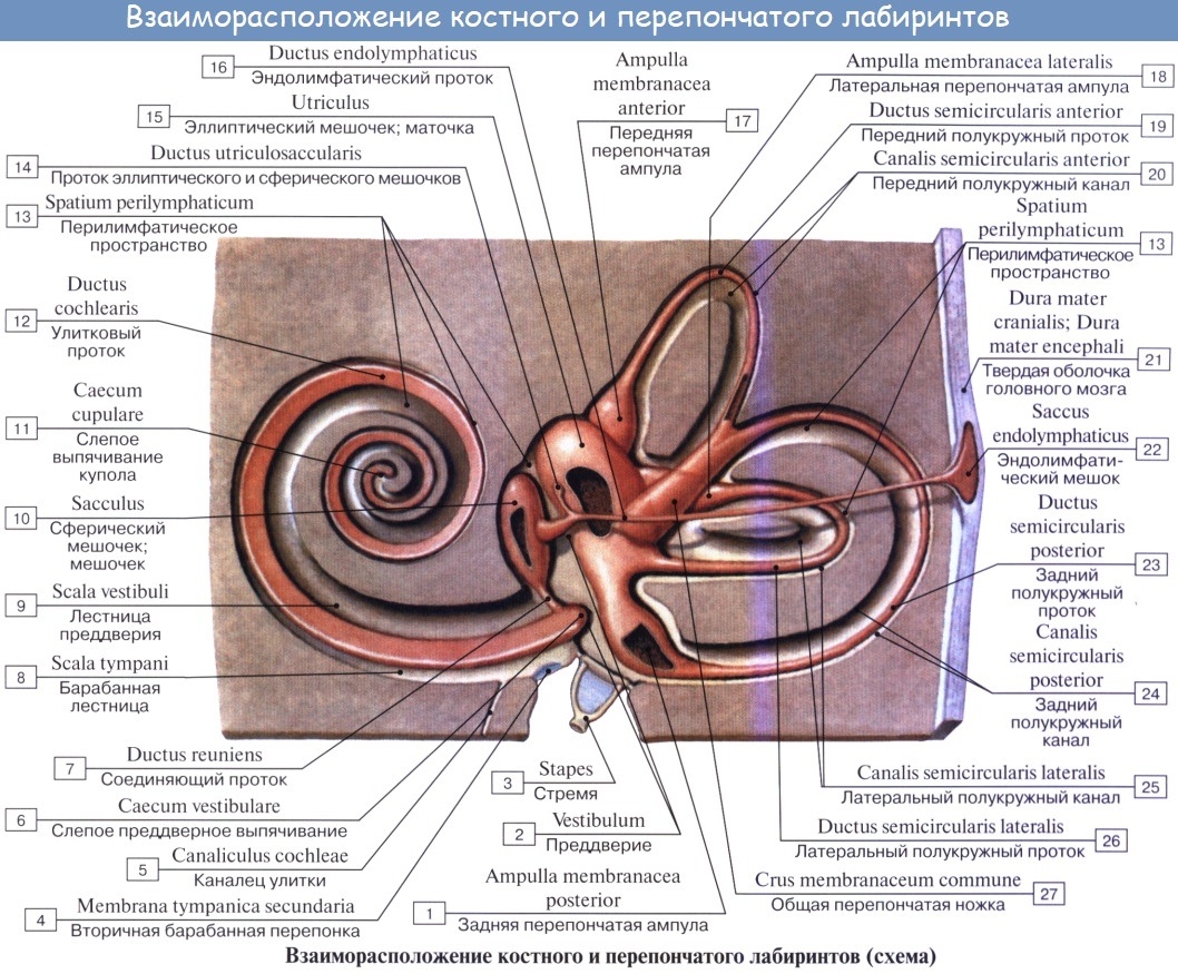 Внутри перепончатый лабиринт наполнен прозрачной жидкостью — эндолимфой. Так как перепончатый лабиринт несколько меньше костного, то между стенками того и другого остается промежуток — перилимфатическое пространство, spatium perilymphaticum, наполненное перилимфой.