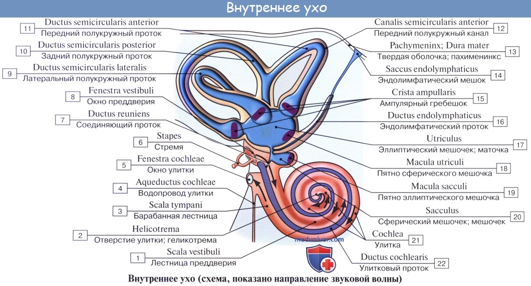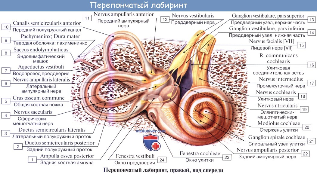 Внутреннее ухо, или лабиринт, располагается в толще пирамиды височной кости между барабанной полостью и внутренним слуховым проходом, через который выходит из лабиринта п. vestibulocochlearis. Различают костный и перепончатый лабиринты, причем последний лежит внутри первого.