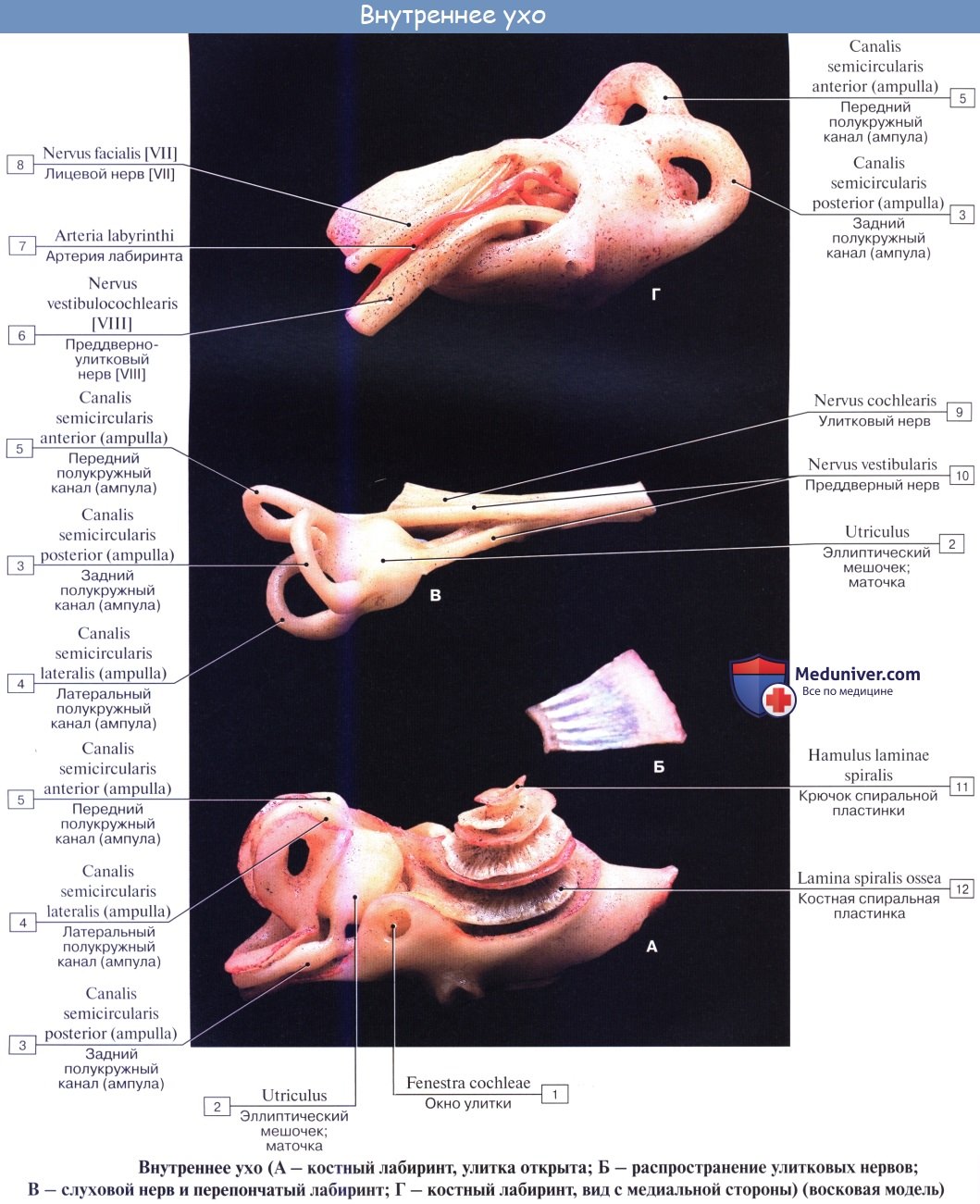Костный лабиринт, labyrinthus osseus, представляет ряд мелких сообщающихся между собой полостей, стенки которых состоят из компактной кости. В нем различают три отдела: преддверие, полукружные каналы и улитку; улитка лежит спереди, медиально и несколько книзу от преддверия, а полукружные каналы — кзади, латерально и кверху от него.