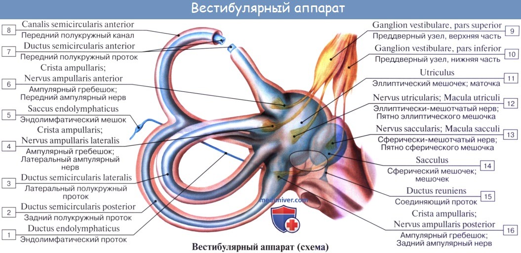 В преддверии костного лабиринта заложены две части перепончатого лабиринта: utriculus (эллиптический мешочек) и sacculus (сферический мешочек). Utriculus, имеющий форму замкнутой трубки, занимает recessus ellipticus преддверия и соединяется сзади с тремя перепончатыми полукружными протоками, ductus semicirculares, которые лежат в таких же костных каналах, повторяя в точности форму последних.