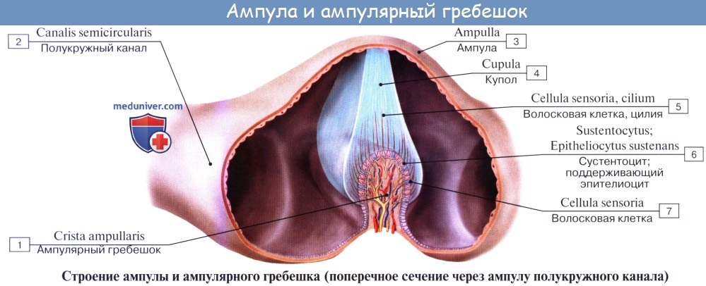 У каждого канала две ножки, которые, однако, открываются в преддверии только пятью отверстиями, так как соседние концы переднего и заднего каналов соединяются в одну общую ножку, cms commune. Одна из ножек каждого канала перед своим впадением в преддверие образует расширение, называемое ампулой. Ножка с ампулой называется crus ampullare, а ножка без расширения — crus simplex.