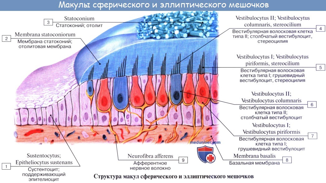 Sacculus — грушевидной формы мешочек, лежит в recessus sphericus преддверия и находится в соединении с utriculus, так же как и с длинным узким^ протоком, ductus endolymphaticus, который проходит через aqueductus vestibuli и оканчивается небольшим слепым расширением, saccus endolymphaticus, в толще твердой оболочки на задней поверхности пирамиды височной кости.