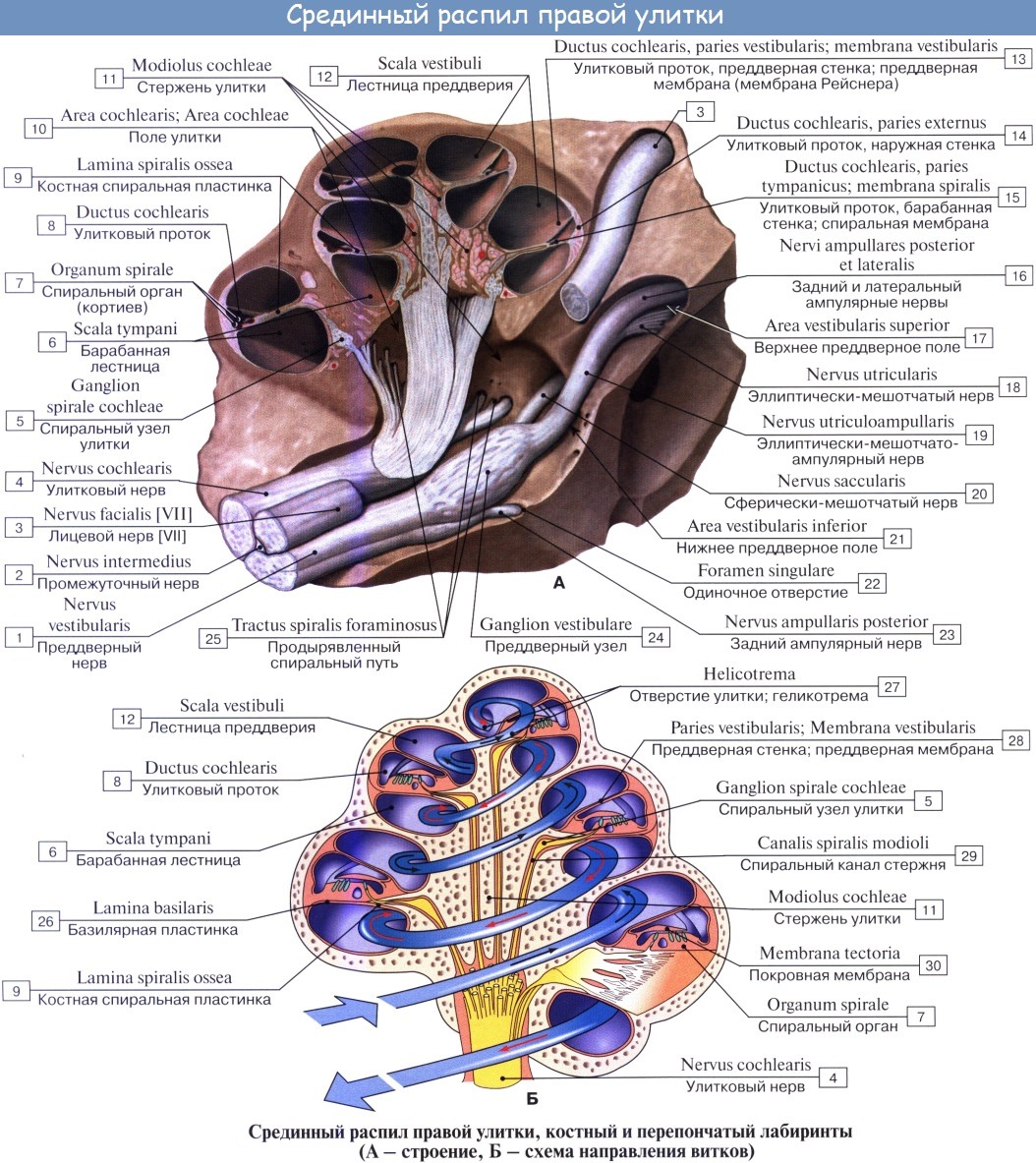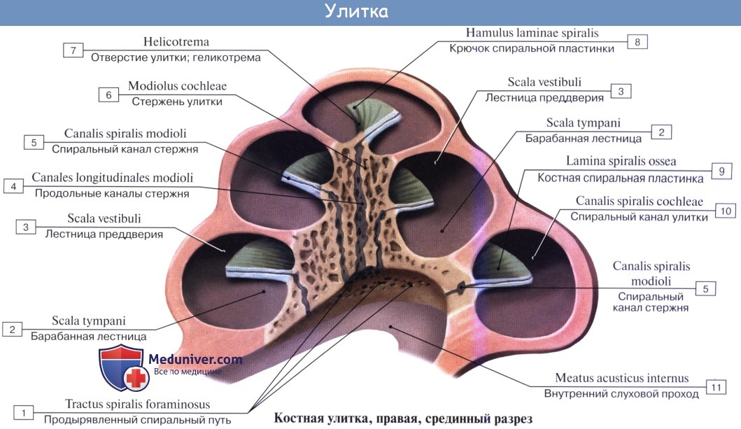 Улитка, cochlea, образуется спиральным костным каналом, canalis spiralis cochleae, который, начиная от преддверия, свертывается наподобие раковины улитки, образуя 2 1\2 круговых хода. Костный стержень, вокруг которого свертываются ходы улитки, лежит горизонтально и называется modiolus.