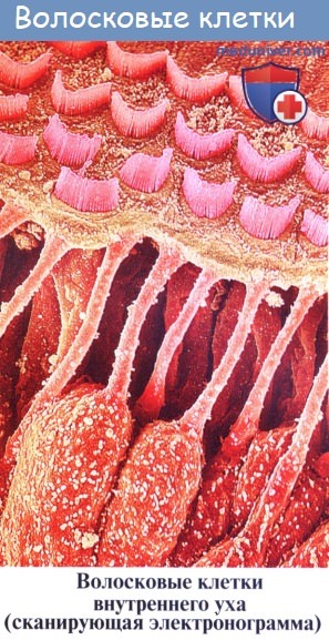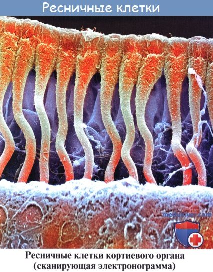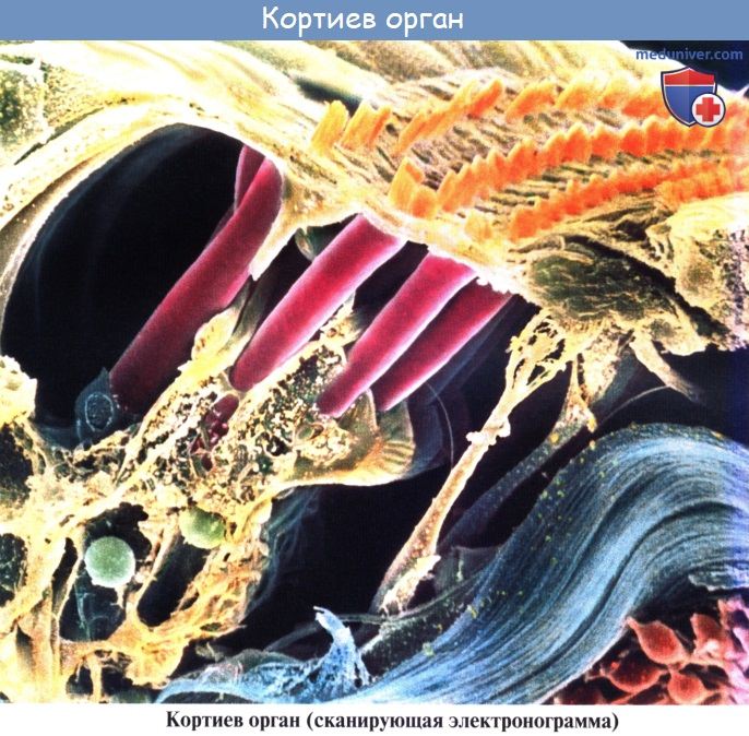 Согласно известной теории Гельмгольца (1875), они являются резонаторами, обусловливающими своими колебаниями восприятие тонов различной высоты, но, по данным электронной микроскопии, эти волокна образуют эластическую сеть, которая в целом резонирует строго градуированными колебаниями. Сам спиральный орган слагается из нескольких рядов эпителиальных клеток, среди которых можно различить чувствительные слуховые клетки с волосками.