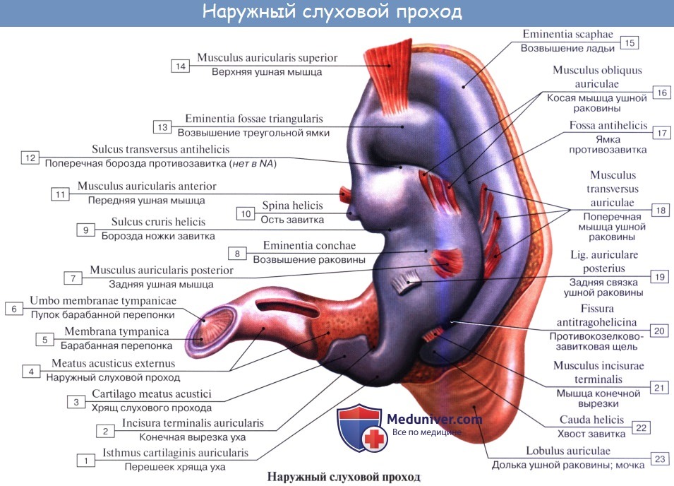 Наружное ухо, auris externa, состоит из ушной раковины и наружного слухового прохода.