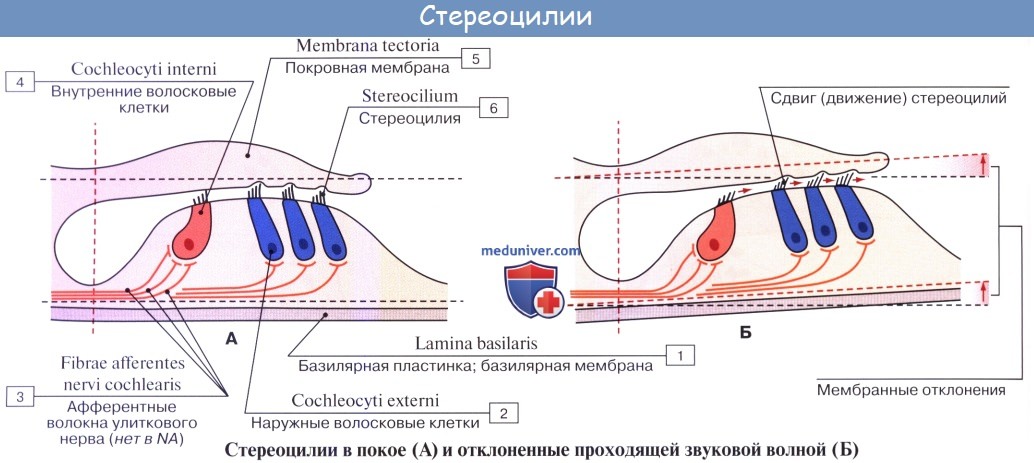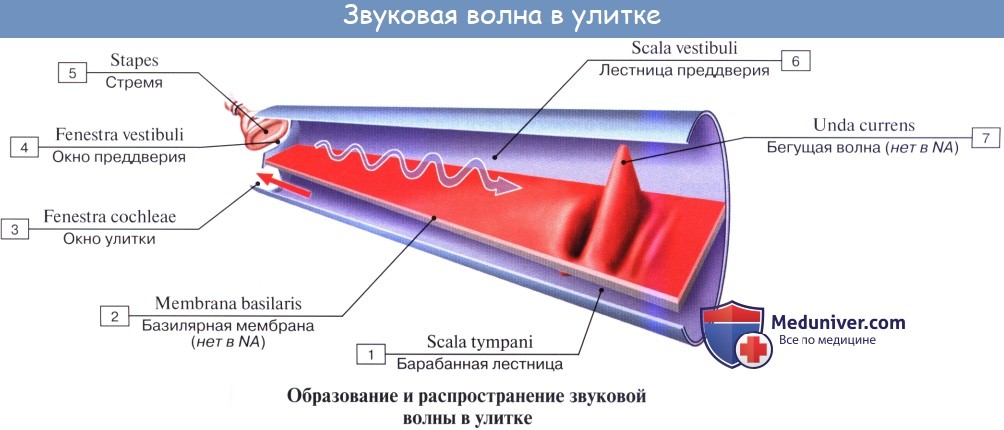 Membrana spiralis на заложенной в ней базилярной пластинке, lamina basilaris, несет аппарат, воспринимающий звуки, — спиральный орган. При посредстве ductus cochlearis scala vestibuli и scala tympani отделяются друг от друга, за исключением места в куполе улитки, где между ними имеется сообщение, называемое отверстием улитки, helicotrema.