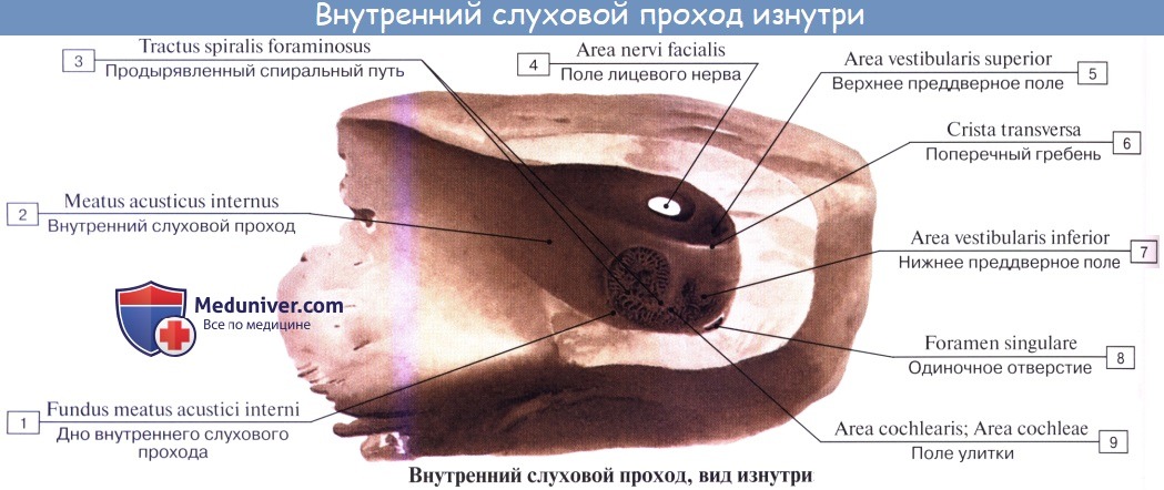 В recessus ellipticus берет начало маленьким отверстием, apertura interna aqueductus vestibuli, водопровод преддверия, проходящий через костное вещество пирамиды и оканчивающийся на ее задней поверхности. Под задним концом гребешка на нижней стенке преддверия находится небольшая ямка, recessus cochledris, соответствующая началу перепончатого хода улитки.