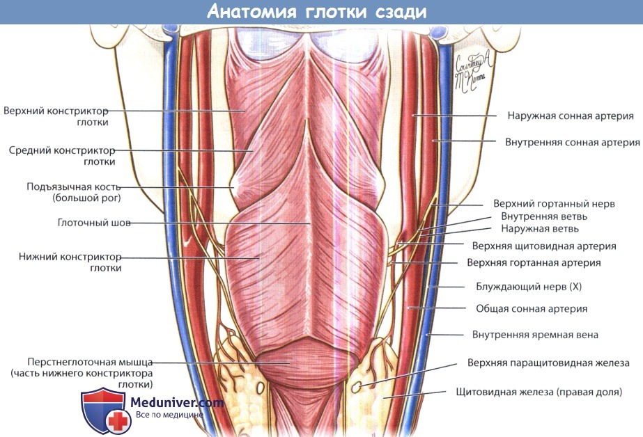Основную массу глотки составляют три парных перекрещивающихся мышцы: верхний, средний и нижний констрикторы глотки. Сзади все они крепятся к глоточному шву, но спереди места их крепления отличаются. Верхний констриктор состоит из четырех частей, каждая из которых имеет свое место прикрепления: