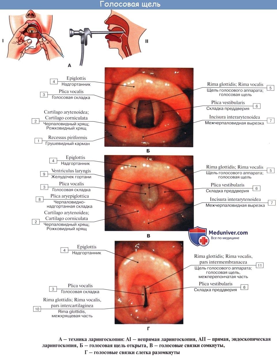 У живого при ларингоскопии (осмотр гортани с помощью гортанного зеркала) можно видеть форму голосовой щели и ее изменения. При акте фонации (звукообразование) pars intermembranacea представляется в виде узкой щели, pars intercartilaginea имеет очертания маленького треугольника; при спокойном дыхании pars intermembranacea расширяется и вся голосовая щель принимает форму треугольника, основание которого располагается между черпаловидными хрящами. Слизистая оболочка гортани выглядит гладкой и имеет равномерную розовую окраску, без локальных изменений рельефа и подвижности. В области голосовых связок она имеет розовую окраску, в области lig. vestibulare — красноватую.