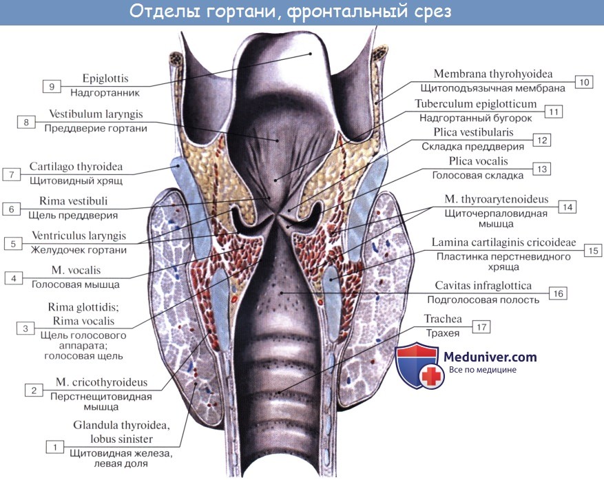 Сама полость гортани по форме напоминает песочные часы: в среднем отделе она сужена, кверху и книзу расширена. Верхний расширенный /этдел полости гортани носит название преддверия гортани, vestibulum laryngis. Преддверие простирается от входа в гортань до парной складки слизистой оболочки, расположенной на боковой стенке полости и носящей название plica vestibularis; в толще последней заложена lig. vestibulare. Стенками преддверия являются: спереди — дорсальная поверхность надгортанника, сзади - верхние части черпаловидных хрящей и plica interarytenoidea, с боков — пар_ная эластическая перепонка, протягивающаяся от plica vestibularis до plica aryepiglottica и называемая membrana fibroelastica laryngis.