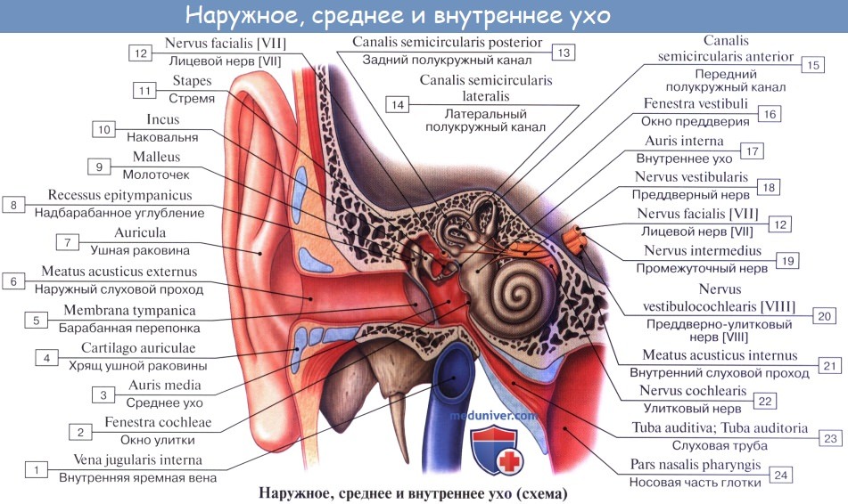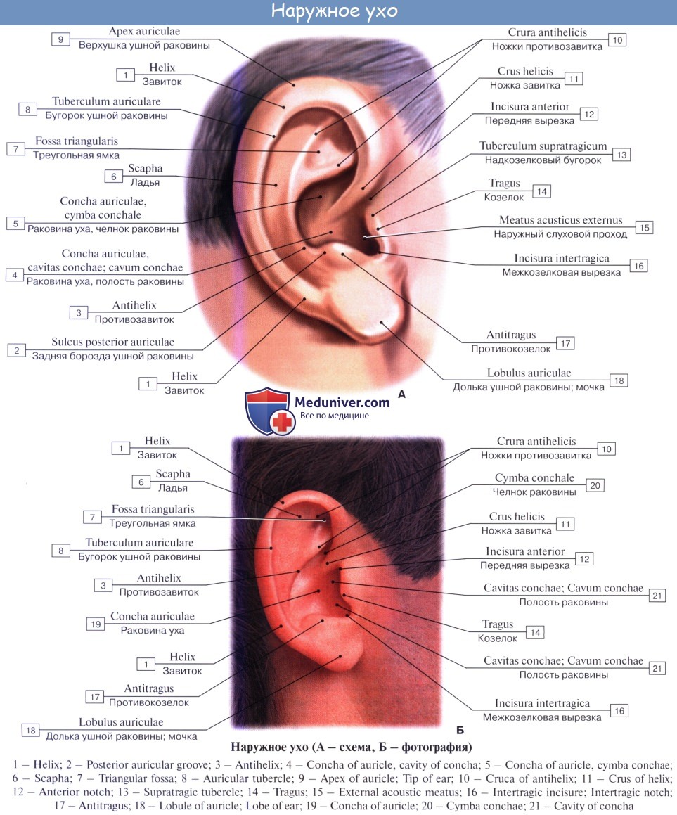 Наружное ухо, auris externa, состоит из ушной раковины и наружного слухового прохода.