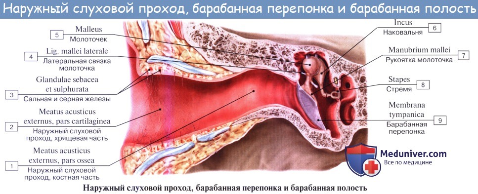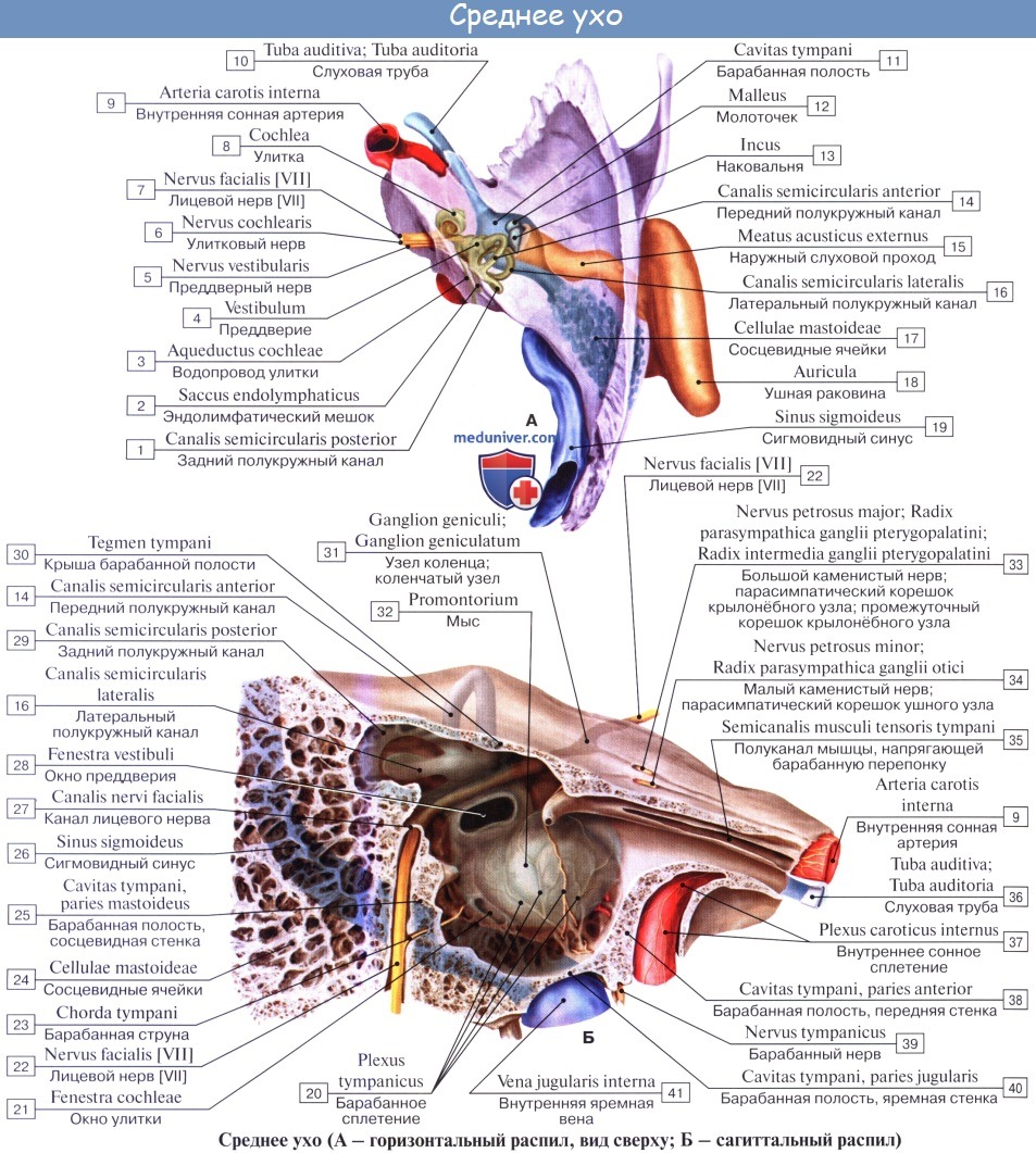 Среднее ухо, auris media, состоит из барабанной полости и слуховой трубы, сообщающей барабанную полость с носоглоткой.
