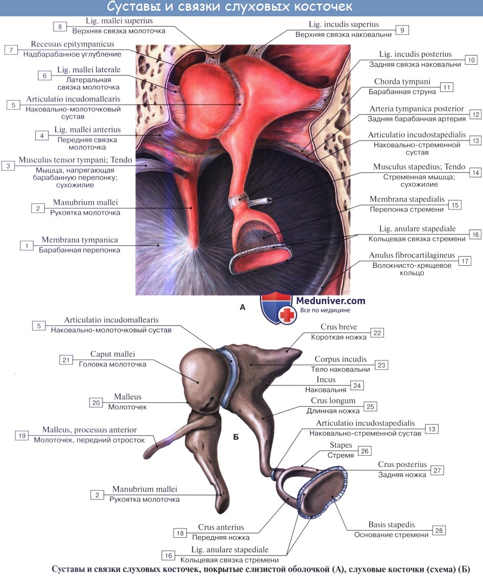 1. Латеральная стенка барабанной полости, paries membranaceus, образована барабанной перепонкой и костной пластинкой наружного слухового прохода. Верхняя куполообразно расширенная часть барабанной полости, recessus membranae tympani superior, содержит две слуховые косточки; головку молоточка и наковальню. При заболевании патологические изменения среднего уха наиболее выражены в этом recessus.