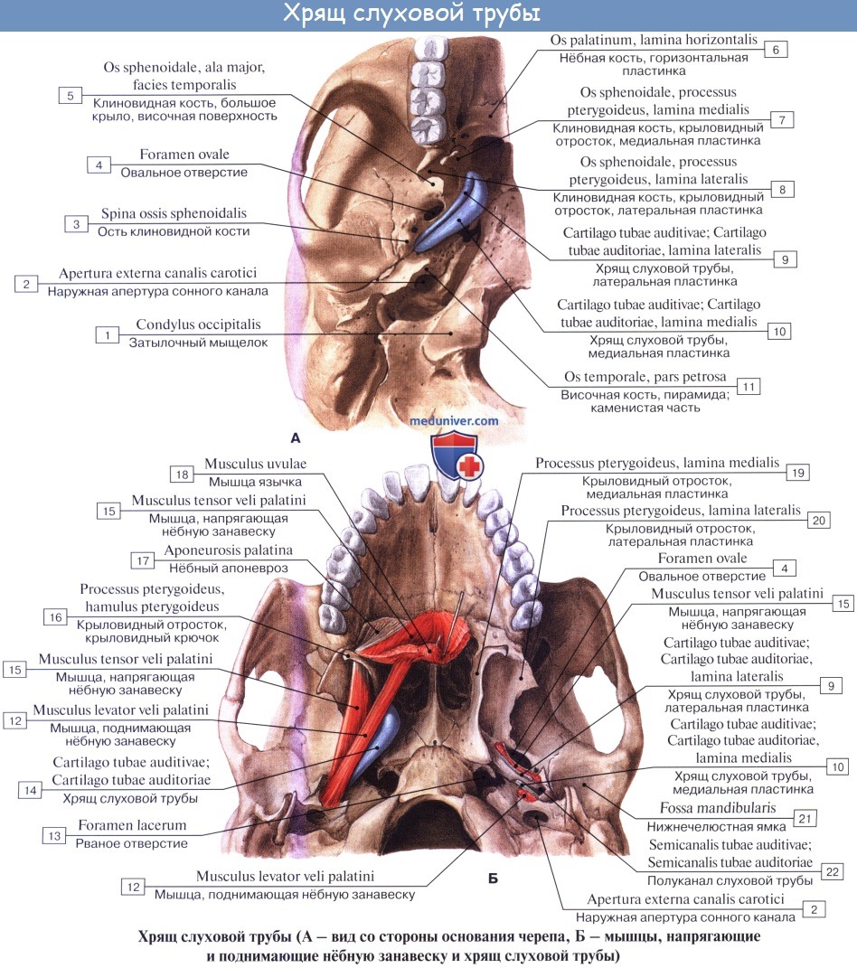 Книзу труба оканчивается на латеральной стенке носоглотки глоточным отверстием, ostium pharyngeum tubae auditivae, причем край хряща, вдаваясь в глотку, образует torus tubarius.