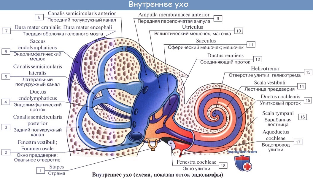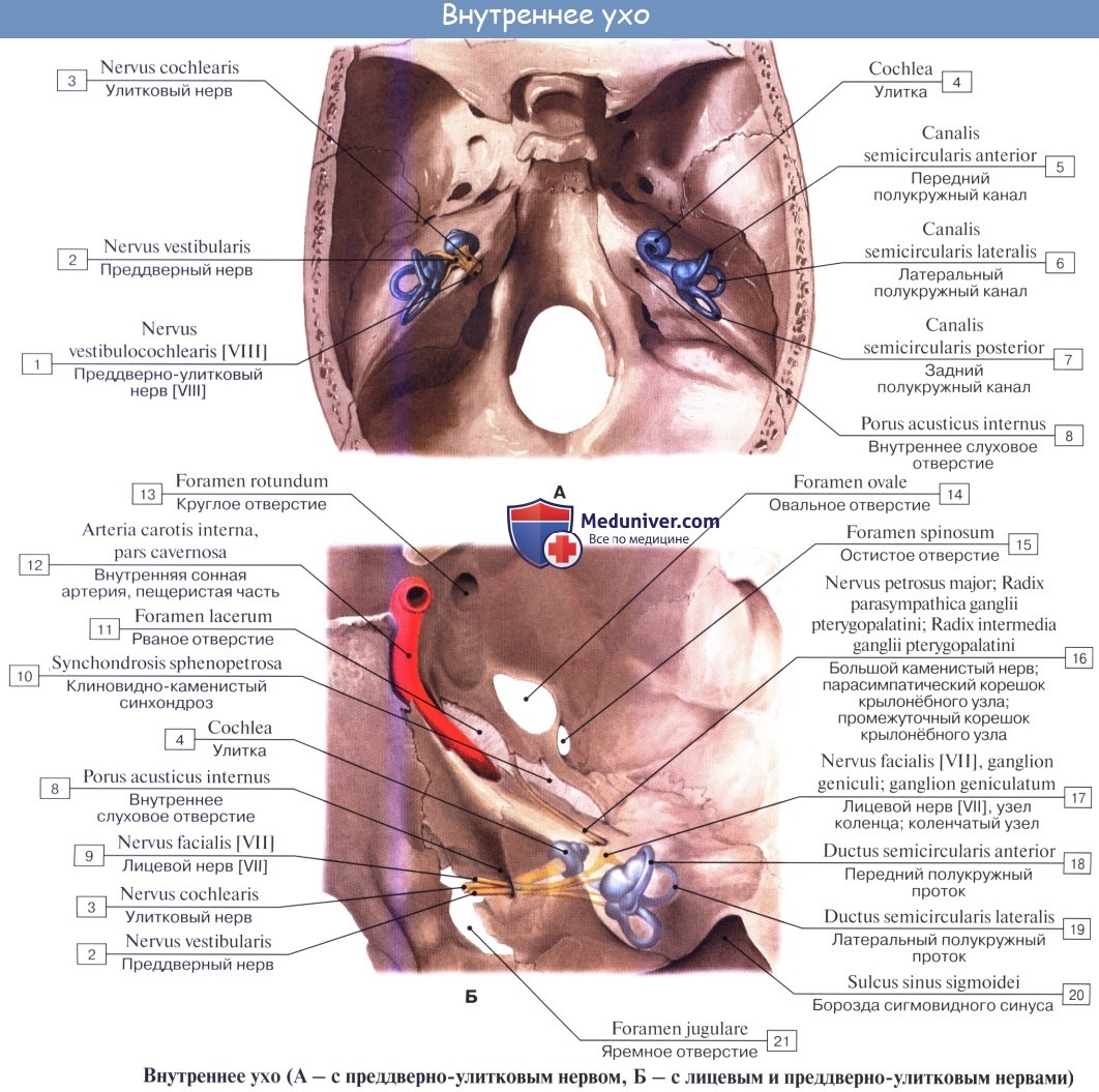 Внутреннее ухо, или лабиринт, располагается в толще пирамиды височной кости между барабанной полостью и внутренним слуховым проходом, через который выходит из лабиринта п. vestibulocochlearis. Различают костный и перепончатый лабиринты, причем последний лежит внутри первого.