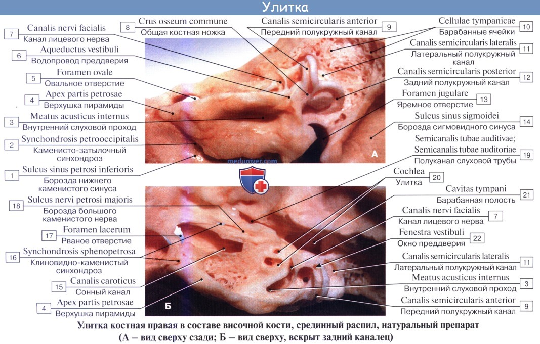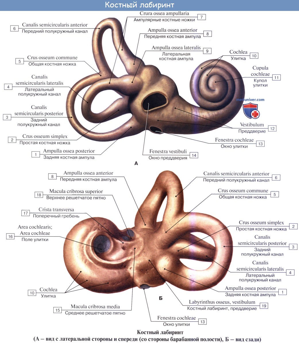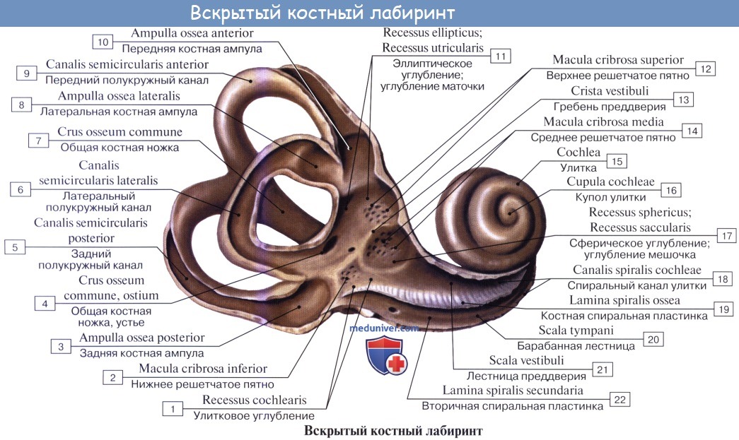 Костный лабиринт, labyrinthus osseus, представляет ряд мелких сообщающихся между собой полостей, стенки которых состоят из компактной кости. В нем различают три отдела: преддверие, полукружные каналы и улитку; улитка лежит спереди, медиально и несколько книзу от преддверия, а полукружные каналы — кзади, латерально и кверху от него.