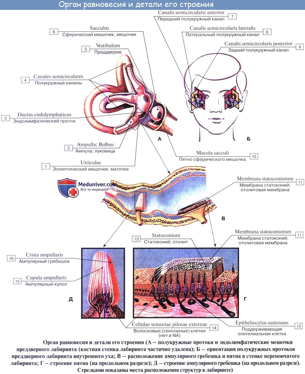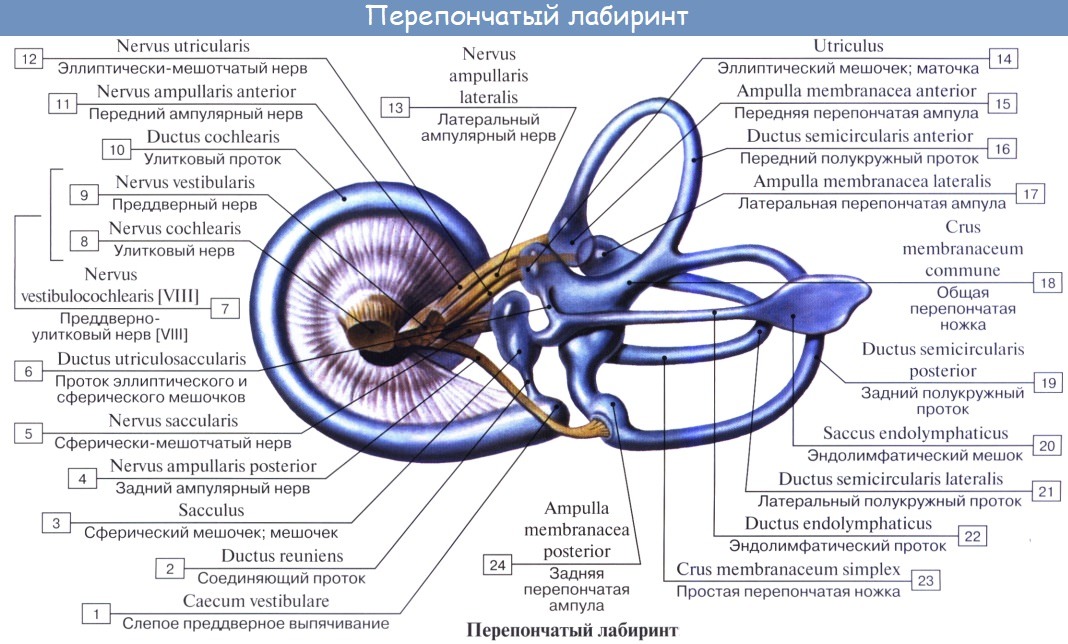 В преддверии костного лабиринта заложены две части перепончатого лабиринта: utriculus (эллиптический мешочек) и sacculus (сферический мешочек). Utriculus, имеющий форму замкнутой трубки, занимает recessus ellipticus преддверия и соединяется сзади с тремя перепончатыми полукружными протоками, ductus semicirculares, которые лежат в таких же костных каналах, повторяя в точности форму последних.