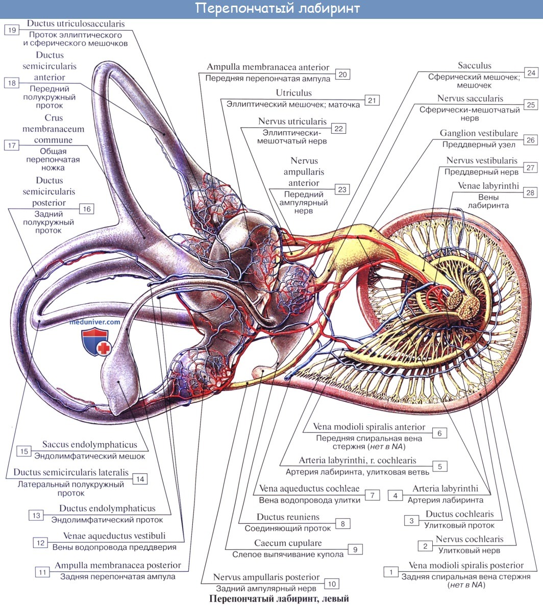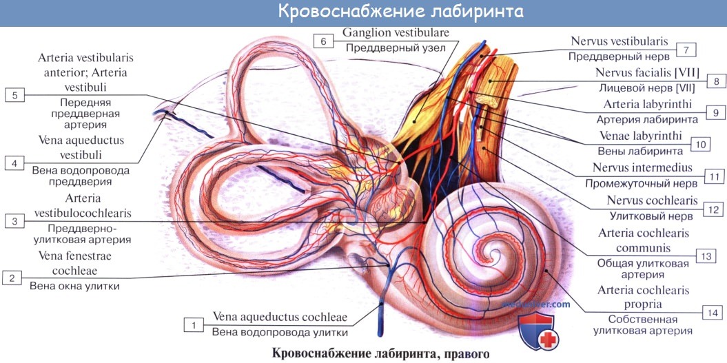 Артерии внутреннего уха происходит из a. labyrinthi, ветви a. basilaris. Идя вместе с n. vestibulocochlearis во внутреннем слуховом проходе, a. labyrinthi разветвляется в ушном лабиринте.