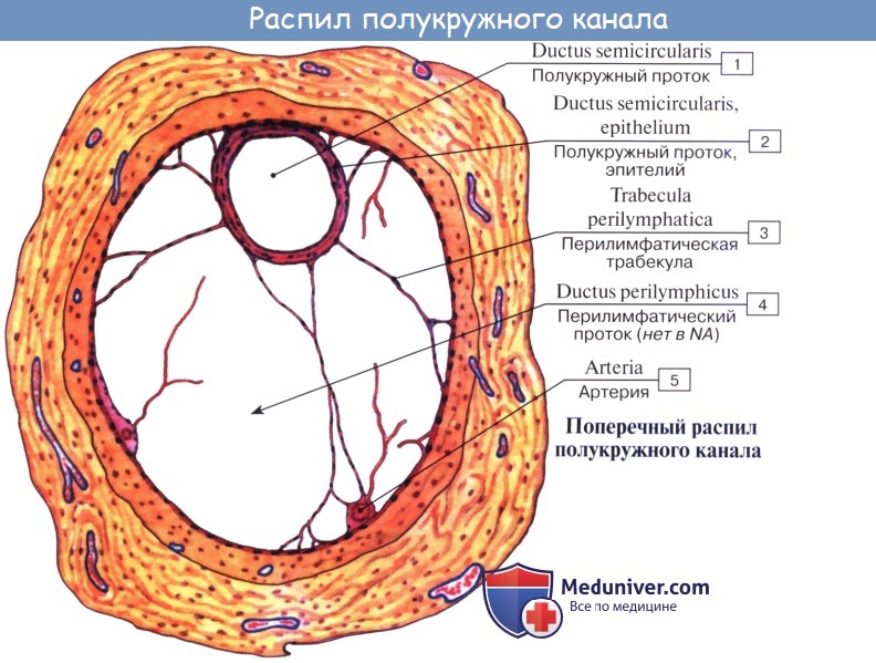 Перепончатый лабиринт в области полукружных протоков подвешен на плотной стенке костного лабиринта сложной системой нитей и мембран. Этим предотвращается смещение перепончатого лабиринта при значительных движениях.