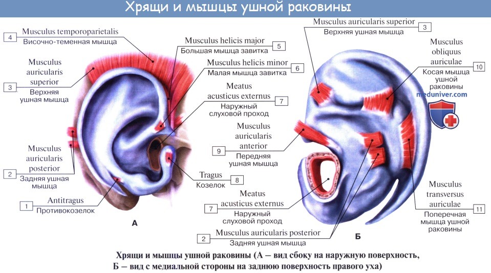 Ушная раковина, auricula, называемая обычно просто ухом, образована эластическим хрящом, покрытым кожей. Этот хрящ определяет внешнюю форму ушной раковины и ее выступы: свободный загнутый край — завиток, helix, и параллельно ему — противозавиток, anthelix, а также передний выступ — козелок, tragus, и лежащий сзади него противокозелок, antitragus.