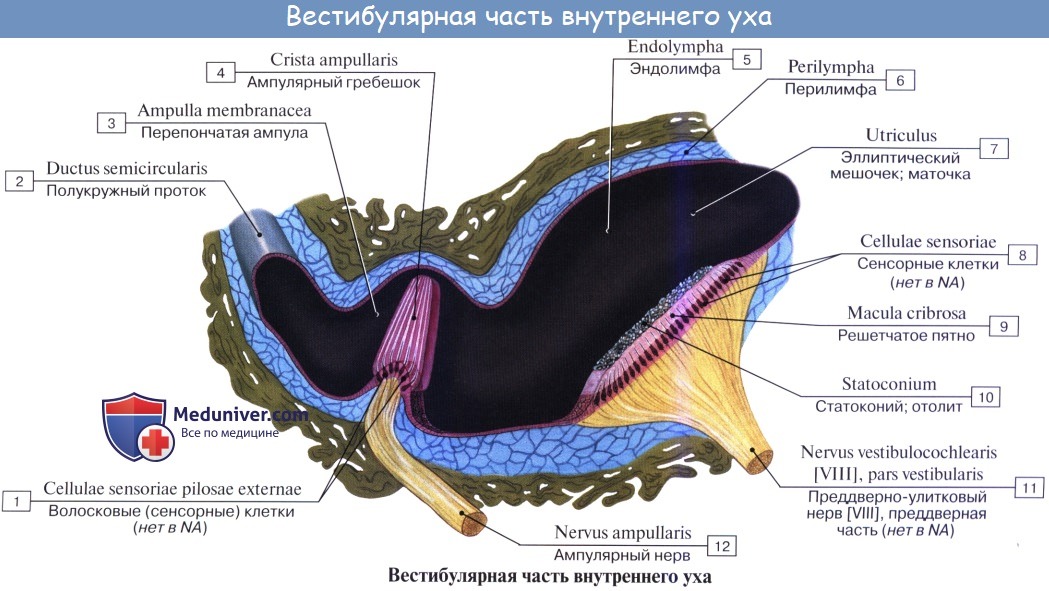 На латеральной стенке преддверия, обращенной к барабанной полости, имеется уже известное нам отверстие, fenestra vestibuli, занятое пластинкой стремени. Другое отверстие, fenestra cochleae, затянутое membrana tympani secundaria, находится у начала улитки. Посредством гребешка, crista vestibuli, проходящего на внутренней поверхности медиальной стенки преддверия, полость последнего делится на два углубления, из которых заднее, соединяющееся с полукружными каналами, носит название recessus ellipticus, а переднее, ближайшее к улитке, — recessus sphericus.