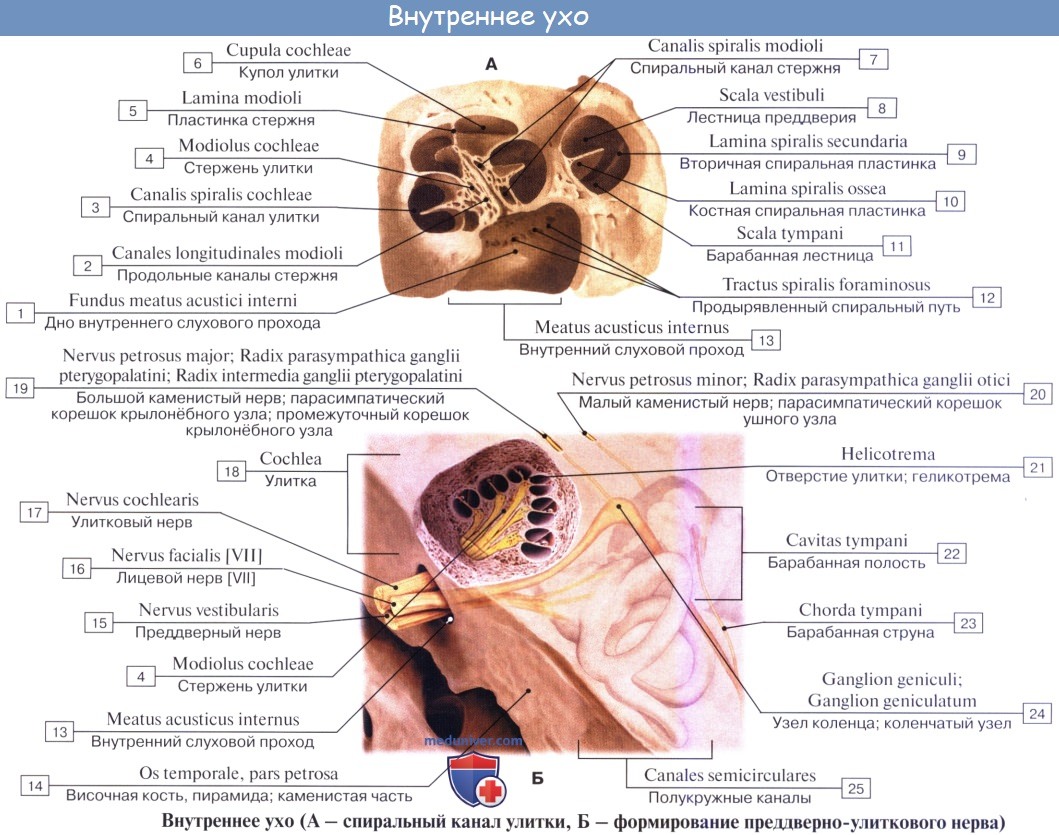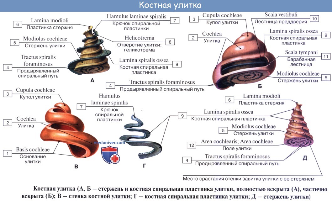 Улитка, cochlea, образуется спиральным костным каналом, canalis spiralis cochleae, который, начиная от преддверия, свертывается наподобие раковины улитки, образуя 2 1\2 круговых хода. Костный стержень, вокруг которого свертываются ходы улитки, лежит горизонтально и называется modiolus.