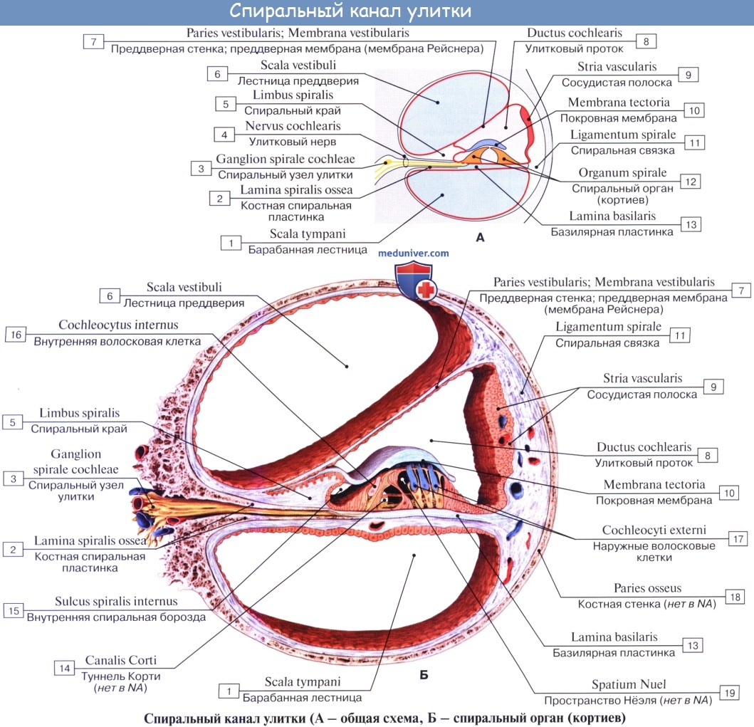 Membrana spiralis на заложенной в ней базилярной пластинке, lamina basilaris, несет аппарат, воспринимающий звуки, — спиральный орган. При посредстве ductus cochlearis scala vestibuli и scala tympani отделяются друг от друга, за исключением места в куполе улитки, где между ними имеется сообщение, называемое отверстием улитки, helicotrema.