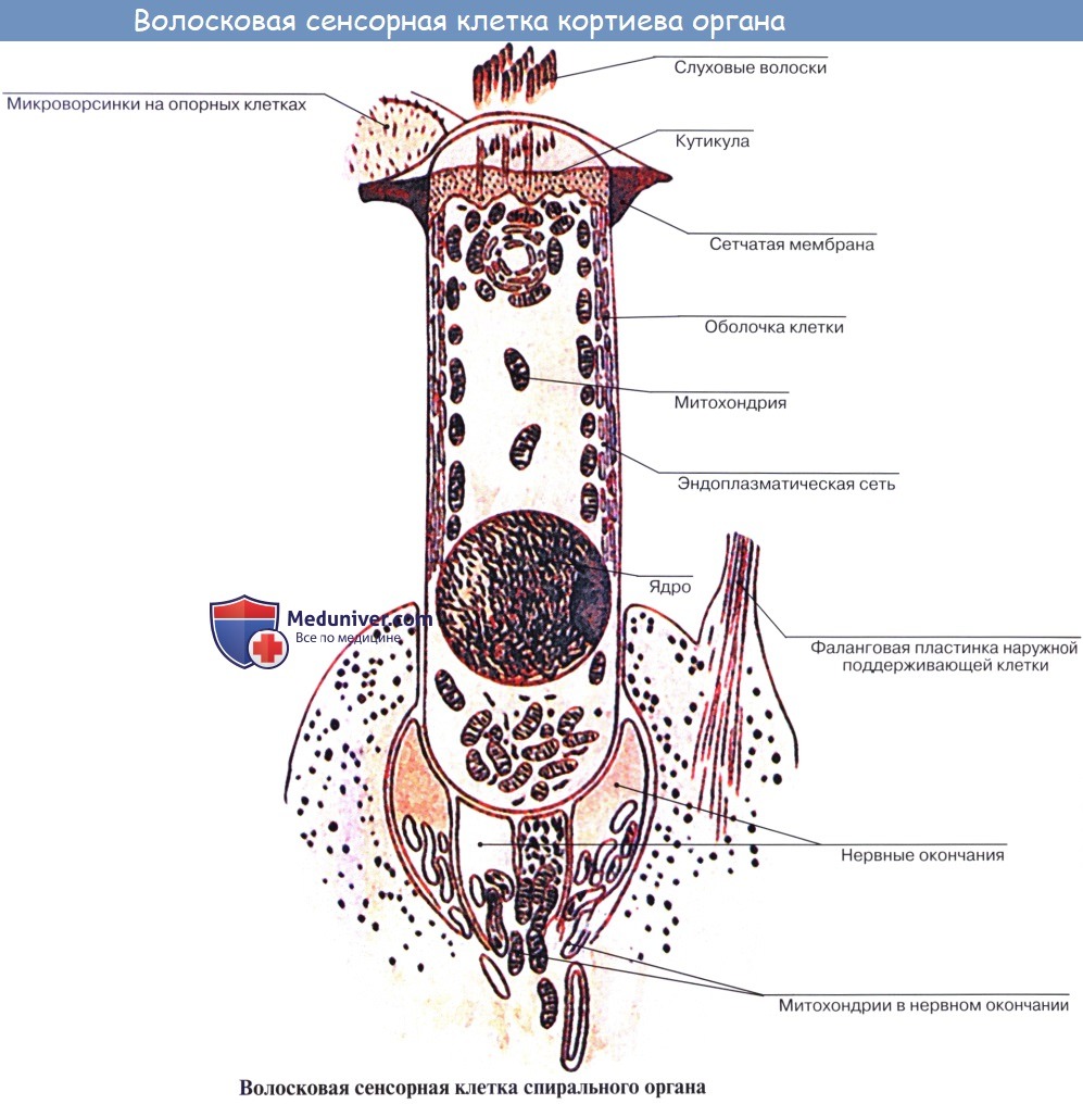 Согласно известной теории Гельмгольца (1875), они являются резонаторами, обусловливающими своими колебаниями восприятие тонов различной высоты, но, по данным электронной микроскопии, эти волокна образуют эластическую сеть, которая в целом резонирует строго градуированными колебаниями. Сам спиральный орган слагается из нескольких рядов эпителиальных клеток, среди которых можно различить чувствительные слуховые клетки с волосками.