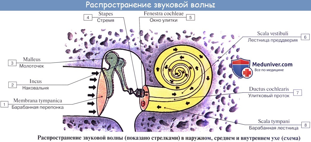 3) аккомодация звукопроводящего аппарата к звукам различной силы и высоты. Основным принципом работы среднего уха в целом является звукопроводимость от барабанной перепонки к овальному окну преддверия, fenestra vestibuli.