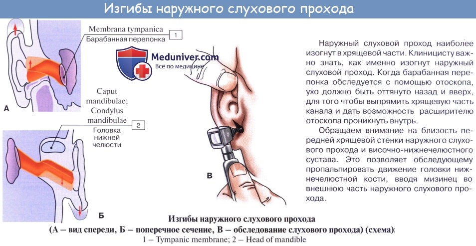 Направление целого слухового прохода в общем фронтальное, но он идет не прямолинейно, а образуя S-образный изгиб как в горизонтальной, так и в вертикальной плоскости. Вследствие изгибов слухового прохода, для того чтобы увидеть находящуюся в глубине барабанную перепонку, необходимо его выпрямить, оттягивая ушную раковину назад, кверху и кнаружи.