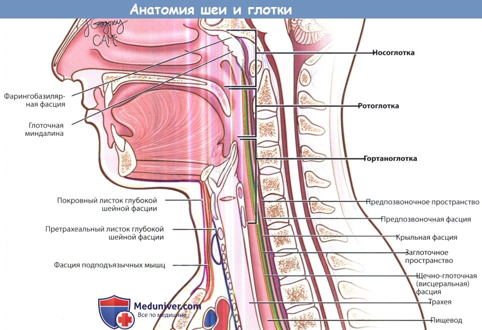 Таким образом, в глотке выделяют носоглотку, ротоглотку и гортаноглотку. Все три этих отдела имеют схожую цилиндрическую мышечную основу, покрыты фасцией и слизистой оболочкой.