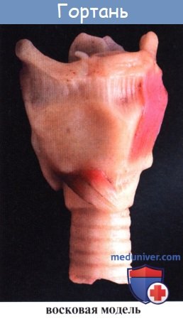 Нижний расширенный отдел гортани, cavitas infraglottica, постепенно суживается книзу и переходит в трахею.