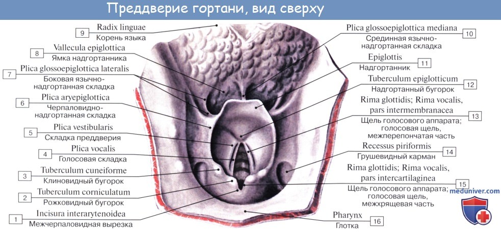 Сама полость гортани по форме напоминает песочные часы: в среднем отделе она сужена, кверху и книзу расширена. Верхний расширенный /этдел полости гортани носит название преддверия гортани, vestibulum laryngis. Преддверие простирается от входа в гортань до парной складки слизистой оболочки, расположенной на боковой стенке полости и носящей название plica vestibularis; в толще последней заложена lig. vestibulare. Стенками преддверия являются: спереди — дорсальная поверхность надгортанника, сзади - верхние части черпаловидных хрящей и plica interarytenoidea, с боков — пар_ная эластическая перепонка, протягивающаяся от plica vestibularis до plica aryepiglottica и называемая membrana fibroelastica laryngis.